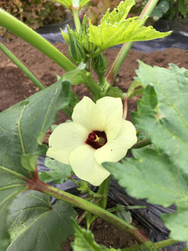 オクラの花が咲き、実を付け出しました。花が咲いてから4日くらいで10センチのオクラとなります。生でも美味しく食べられます。暑い夏をオクラを食べて乗り切りましょう。